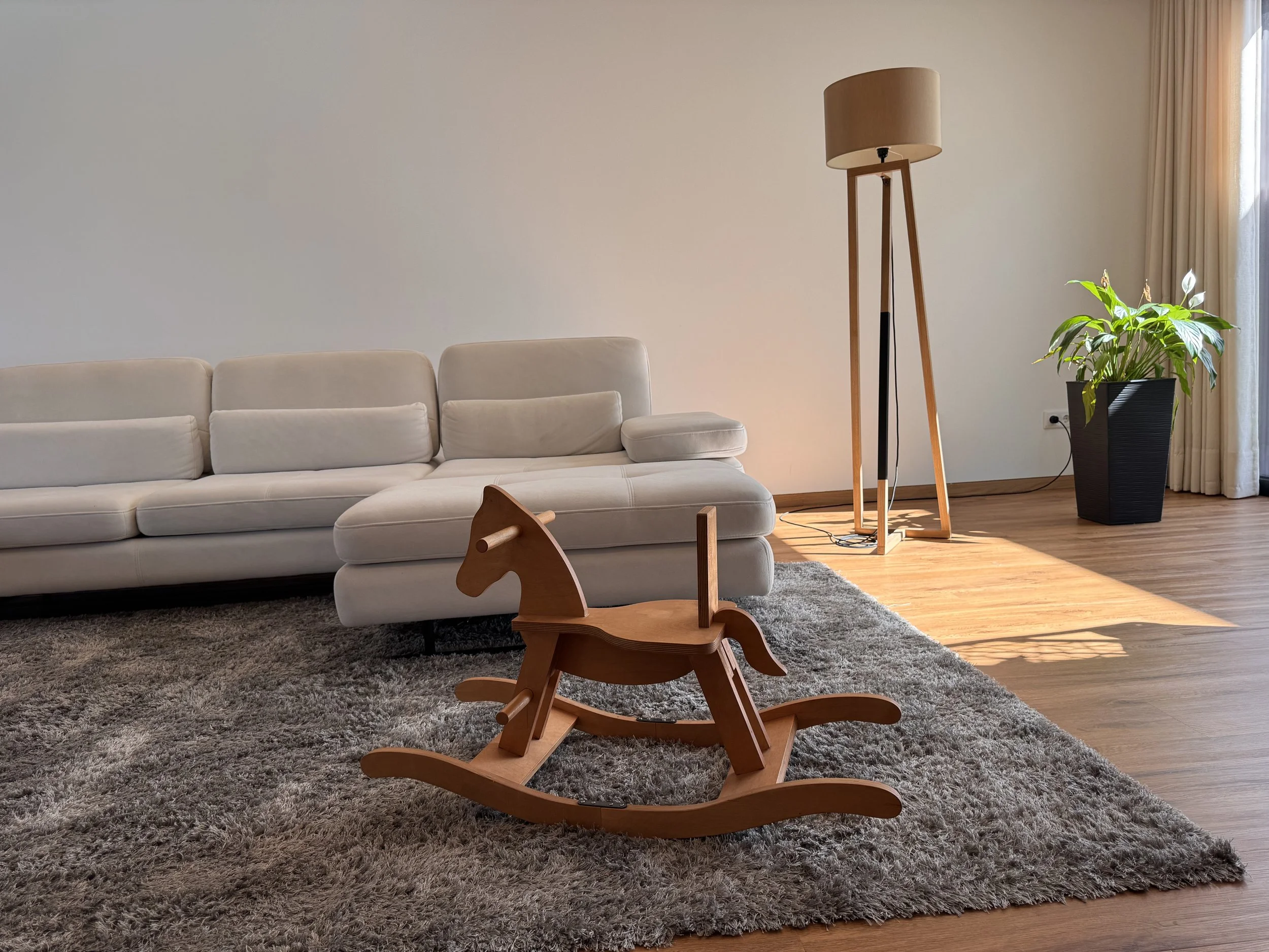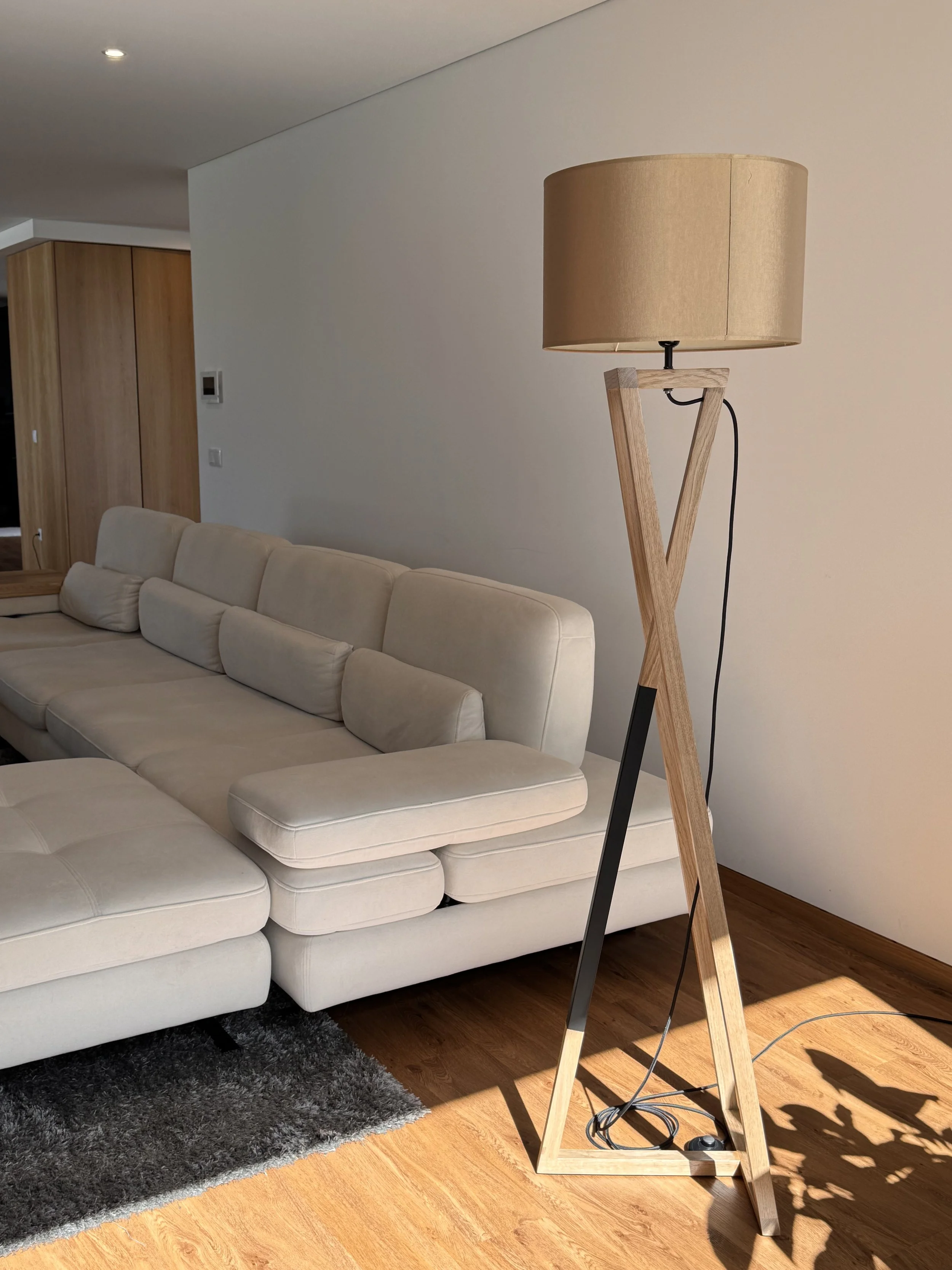 The lamp is a simple vertical composition. Oak carries the form; a steel spine keeps it precise. It casts a soft, diffused light that sits naturally beside the sofa.